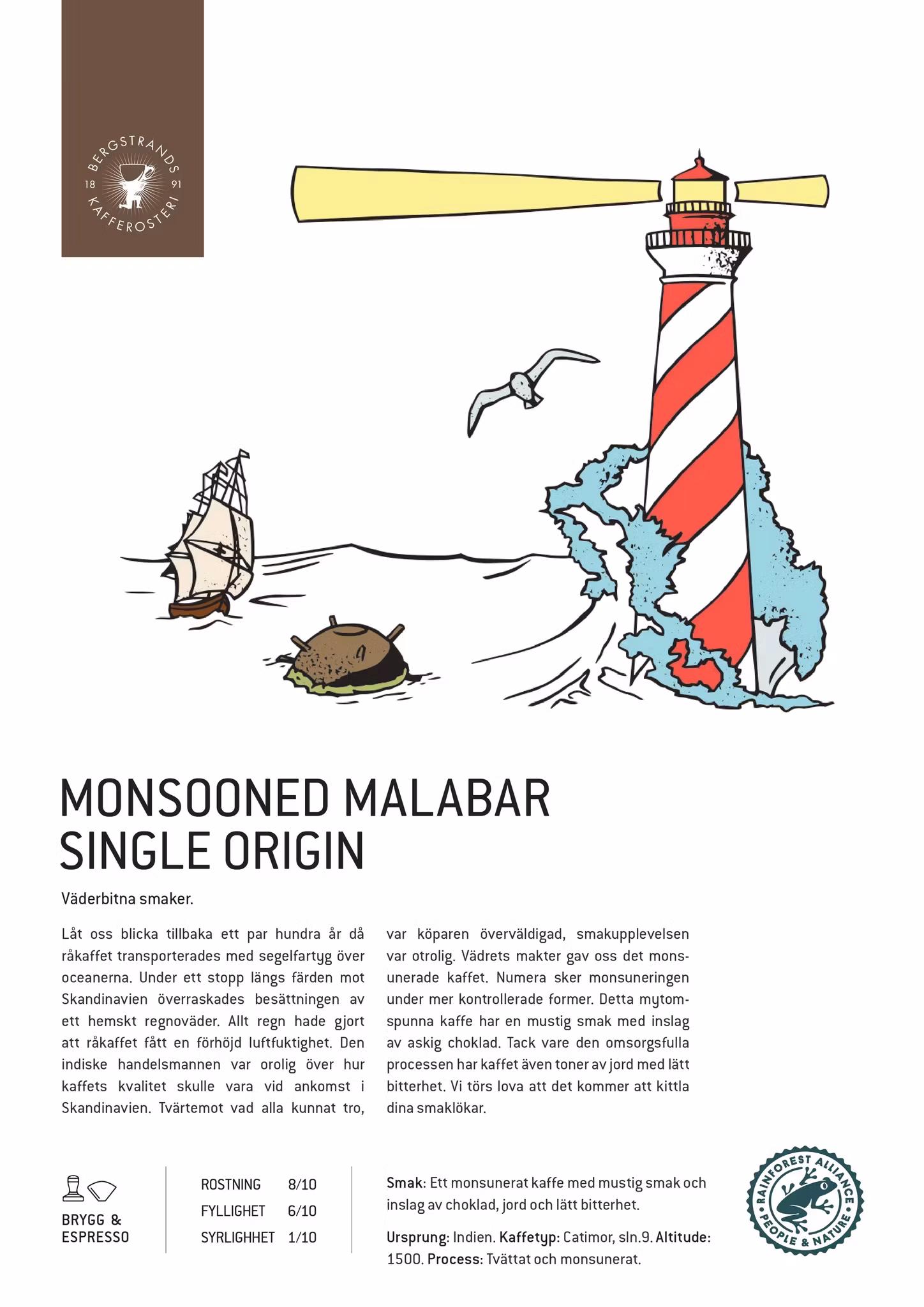 Låt oss blicka tillbaka ett par hundra år då råkaffet transporterades med segelfartyg över oceanerna. Under ett stopp längs färden mot Skandinavien överraskades besättningen av ett hemskt regnoväder. Allt regn hade gjort att råkaffet fått en förhöjd luftfuktighet. Den indiske handelsmannen var orolig över hur kaffets kvalitet skulle vara vid ankomst i Skandinavien. Tvärtemot vad alla kunnat tro, var köparen överväldigad, smakupplevelsen var otrolig. Vädrets makter gav oss det monsunerade kaffet. Numera sker monsuneringen under mer kontrollerade former. Detta mytomspunna kaffe har en mustig smak med inslag av askig choklad. Tack vare den omsorgsfulla processen har kaffet även toner av jord med lätt bitterhet. Vi törs lova att det kommer att kittla dina smaklökar.