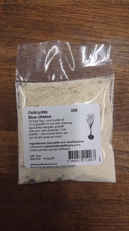 Ostpulver, salt, kärnsmjölkspulver, vasslepulver (från mjölk), maltodextrin (majs, potatis), jästextrakt, surhetsreglerande medel (E270), arom, socker, arom (innehåller mjölk, selleri).