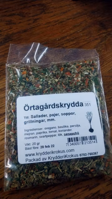 Oregano, basilika, persilja, mejram, paprika, tomat, koriander, rosmarin, svartpeppar, lök, senapsfrö.